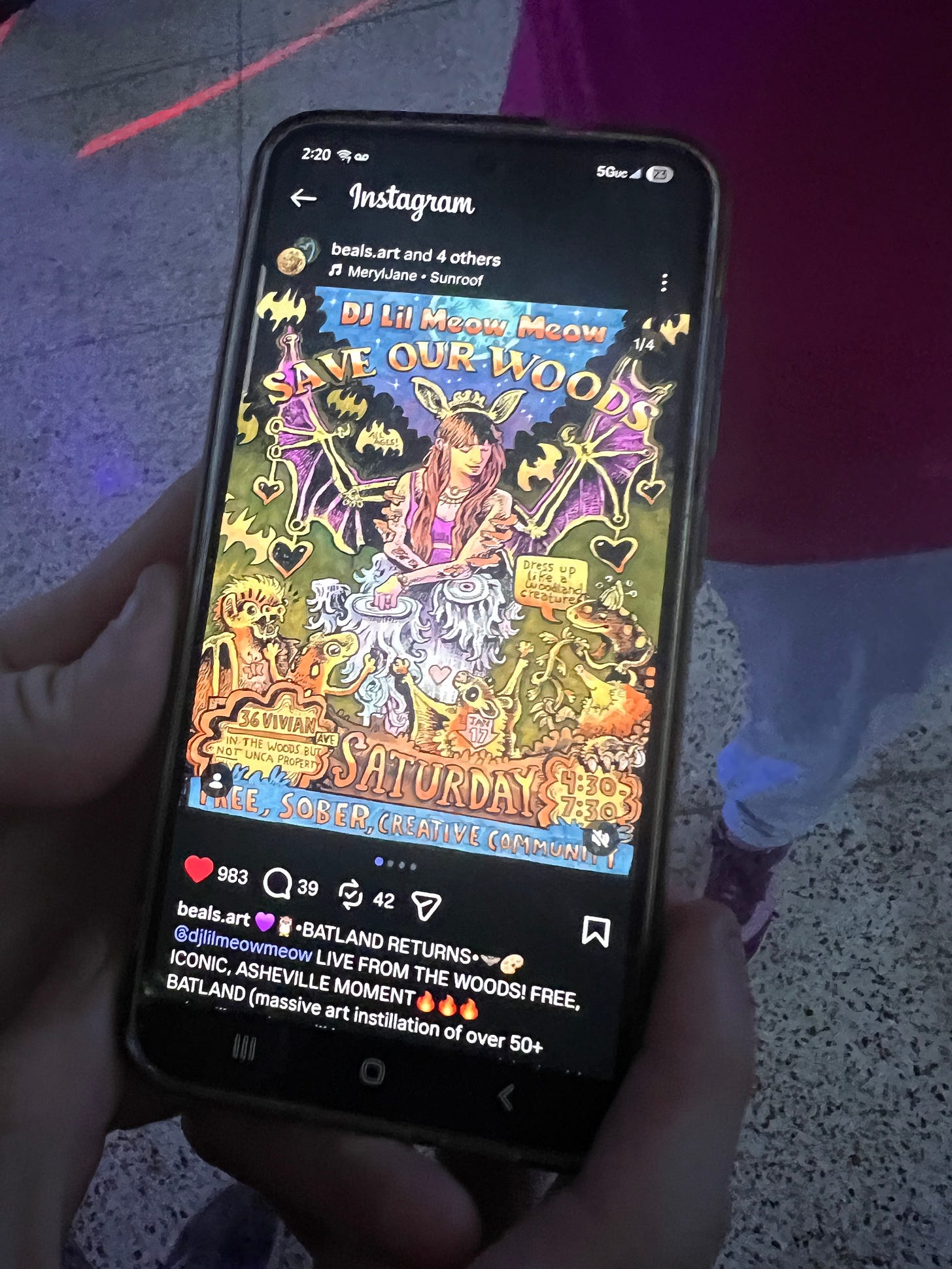 Spencer Beals has taken up the cause of protecting the UNCA woods, one of the last remaining urban green spaces in Asheville. Like the Lorax, he speaks for the trees- and also the creatures of the forest. At a recent Save the Woods event, he shared about the value of the 45 acres up for development and talked about it being home to a female great horned owl who nests there. Known around Asheville for pioneering sketchbook club, Spencer did the most 90’s thing ever in protest- he put together a sanctioned music festival in the woods. The festival, held on private land adjacent to the UNCA Woods, featured a screening of the 1972 Lorax movie and music by DJ Lil MeowMeow. The community turned out to support their beloved woods- but they weren’t the only ones! The Save the Woods festival caught the attention of filmmakers in New York who drove down to create a documentary about the movement.